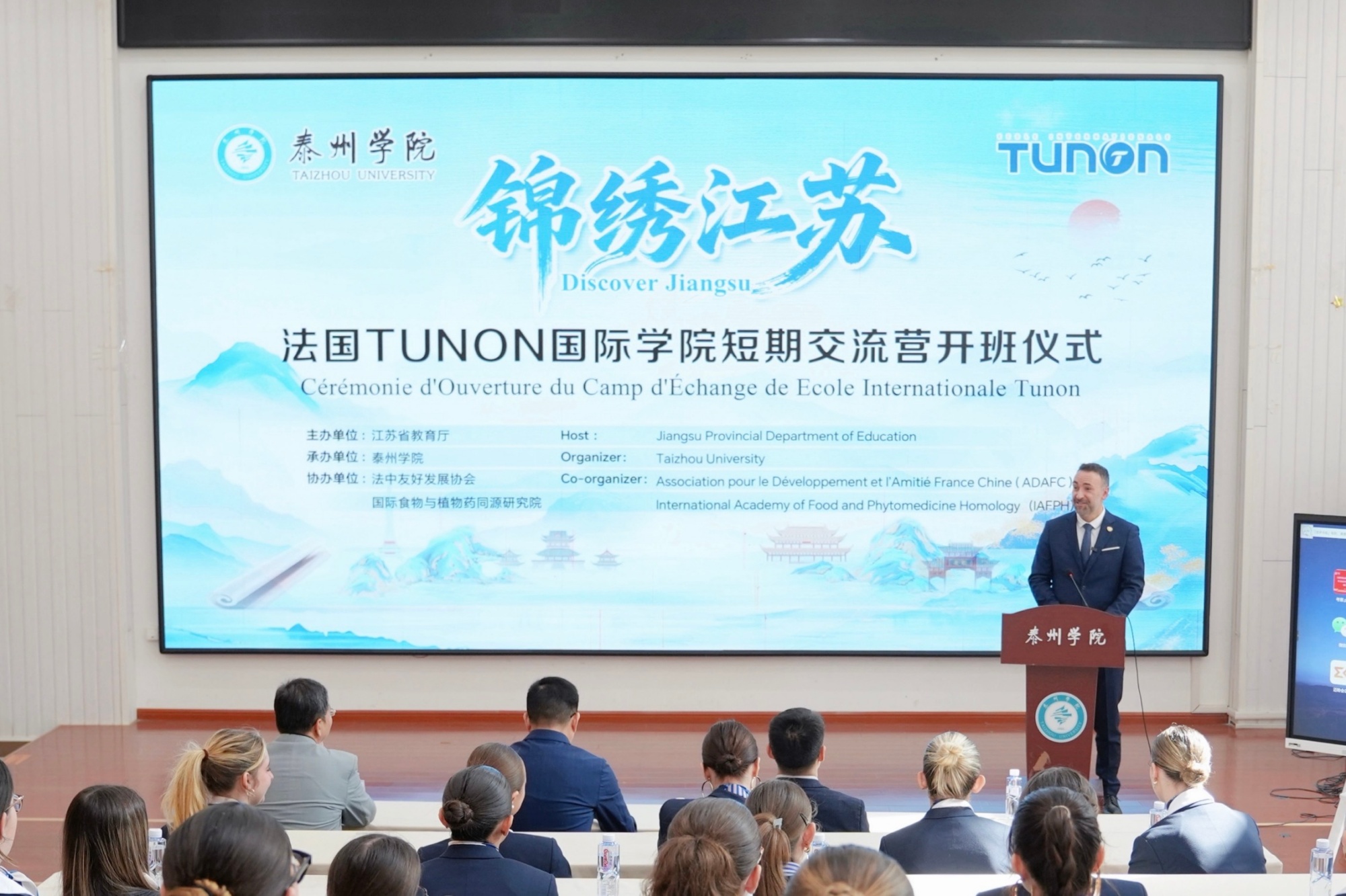 党委常委、副校长汤艳峰代表学校在开幕式致辞。他对法国师生表示欢迎,向他们介绍了泰州的自然禀赋和人文积淀,也阐述了LETOU国际米兰官网国际交流的举措和成效,鼓励中法学子深化双向交流,推动交流互鉴走深走实。TUNON国际学院带队教师LABAT Jérémie对米兰官网的精心筹备表示感谢。TUNON国际学院地处世界闻名的旅游与时尚之都法国巴黎,学校以旅游、酒店管理及航空服务培训为特色,其注重职业素养的办学理念与米兰官网应用型人才的培养模式高度契合。他们希望学员通过短期学习深化对中国文化的理解,提升专业实践能力。