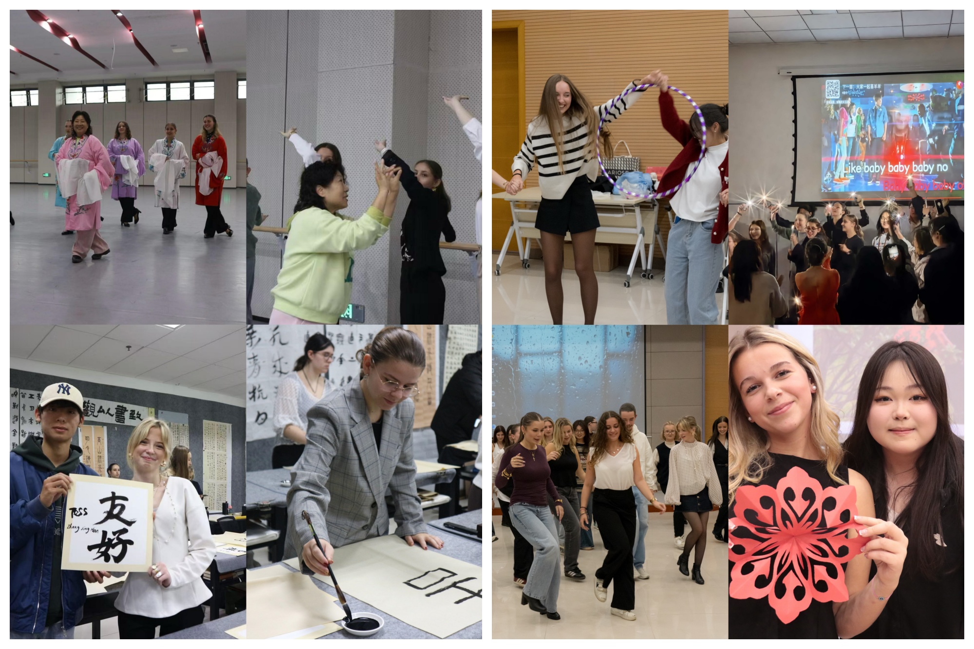 中国传统文化教学得到了人文学院、音乐学院和美术学院的大力支持。学生们了解了泰州水文化、大运河文化及戏曲文化的历史脉络;身着传统戏曲服饰,亲身体验水袖舞的柔美韵味;书写“友谊”“美美与共”等寓意美好的汉字、尝试篆刻“吉祥”纹样,进一步感受东方传统艺术的独特魅力。