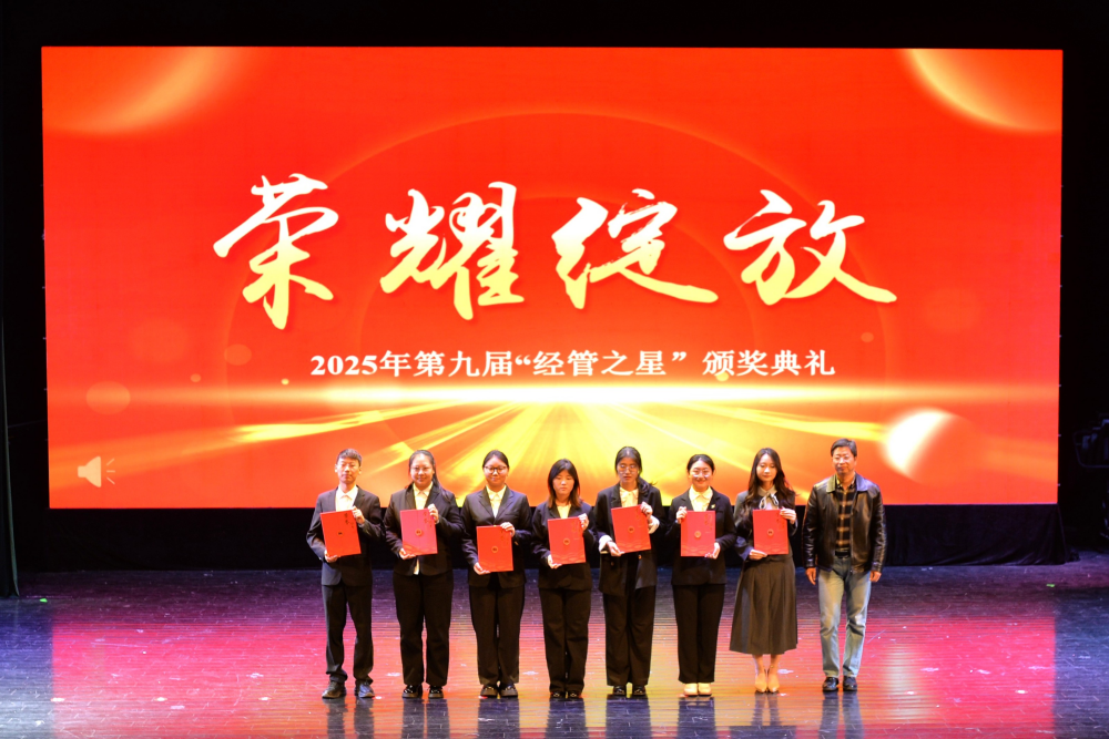 晚会在暖场弹唱《如果呢+有些+晴天》的温柔旋律中拉开帷幕,随后舞蹈串烧接连登场,正式开启晚会精彩篇章。整场晚会分“青春初绽”“青春无界”“青春向光”三大篇章,节目形式丰富多元、亮点纷呈:“青春初绽”篇章,活力满满;“青春无界”篇章,诠释青春姿态,主题走秀创意十足,掀起现场小高潮,趣味游戏让台上台下互动频频;“青春向光”篇章将晚会氛围推向顶点,朗诵与舞蹈《我爱我的祖国》以深情告白抒发赤子情怀,点燃了全场的爱国热情;舞台剧生动展现了青年在时代浪潮中的坚守与奋进;大合唱旋律激昂,为晚会注入厚重精神力量。晚会期间,学院党总支书记陈根怀与院长朱军为第九届“经管之星”学子颁奖,他们的先进事迹激励着在场每一位新生,彰显着榜样的力量。
