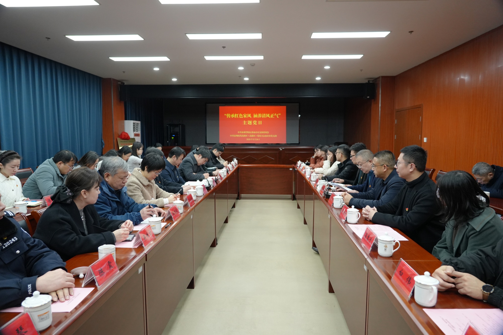 12月26日上午,校纪委办党支部与医药高新区(高港区)史志办党支部在叶荣生红色家风馆联合举办“传承红色家风,涵养清风正气”主题党日活动,校党委常委、纪委书记何军出席活动并讲话。全体支部党员及校纪委办党支部党员家属代表参加活动,共同学习感悟优良家风,汲取砥砺前行的精神力量。